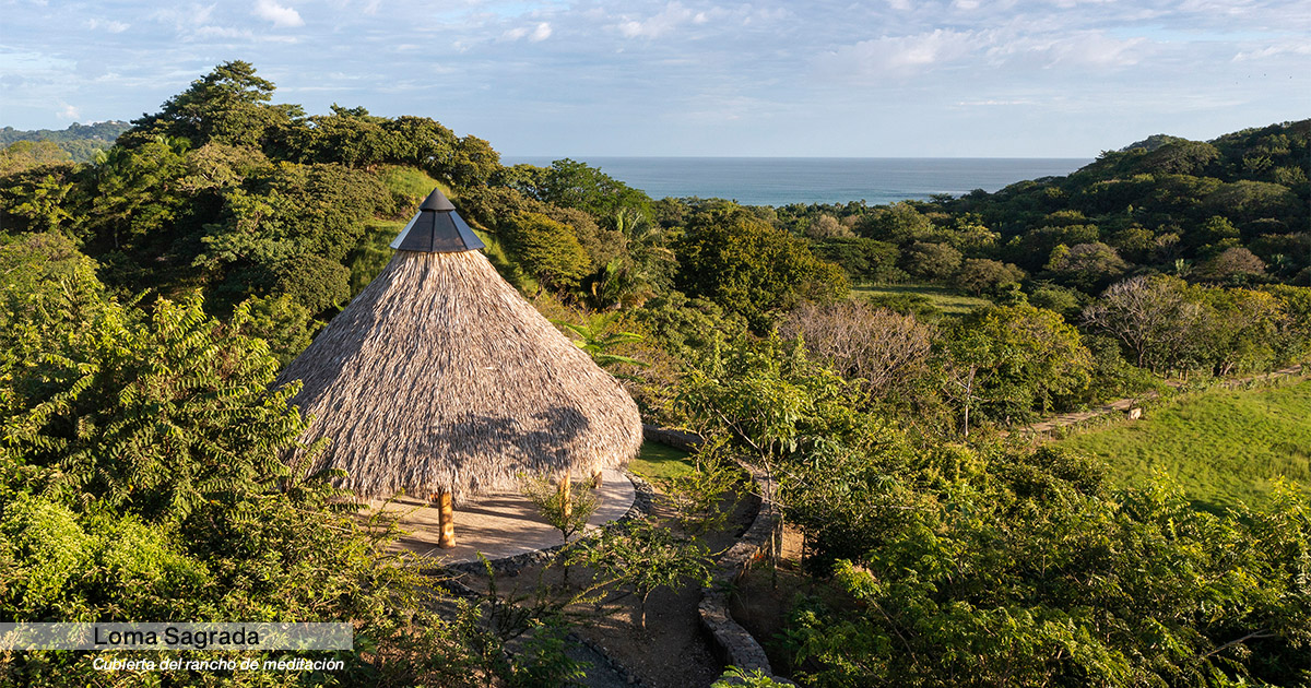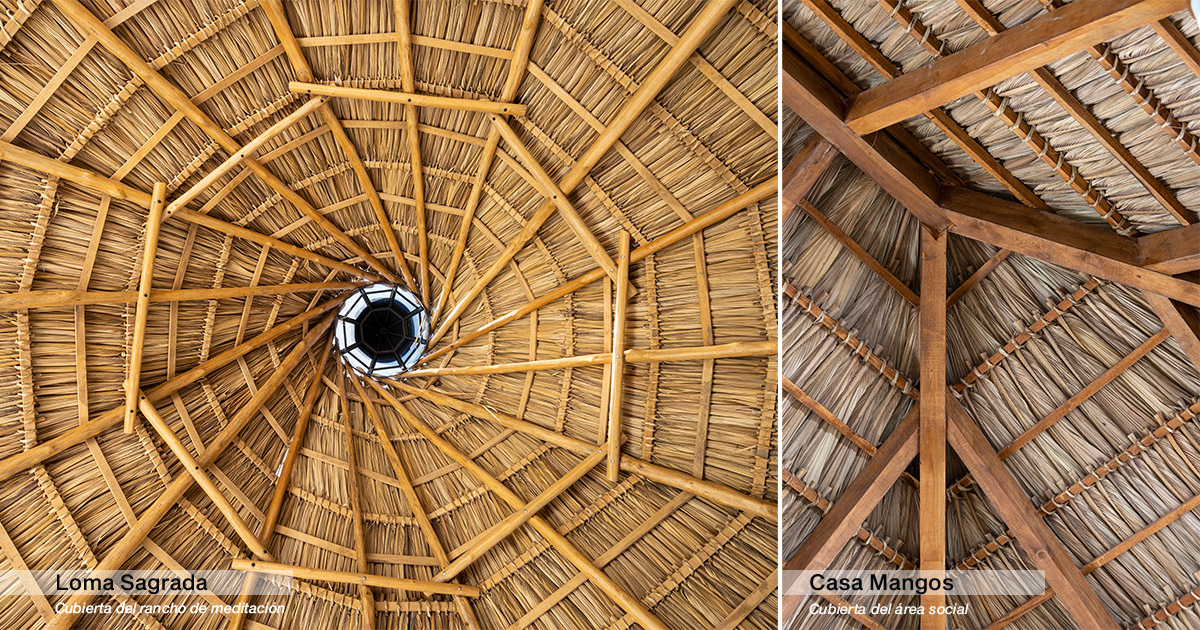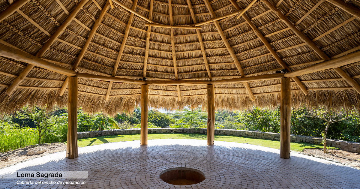 El rancho de meditación de Loma Sagrada, inspirado en la Casa Cósmica bribri y cabécar, utiliza también palma sabal, pero con una intención más introspectiva. Su forma cónica y su escala reducida invitan al recogimiento y a la conexión espiritual, manteniendo un vínculo directo entre el paisaje, el clima y la experiencia del espacio (tema explorado más a fondo en el artículo sobre la Casa Cósmica).