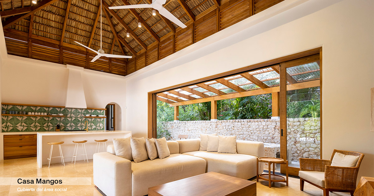 Casa Mangos retoma la tipología chorotega con una cubierta a cuatro aguas de palma sabal. Su estructura de madera expuesta y sus amarres visibles resaltan la sinceridad constructiva, evocando los ranchos tradicionales de Guanacaste, donde el techo es tanto refugio como símbolo de encuentro.
